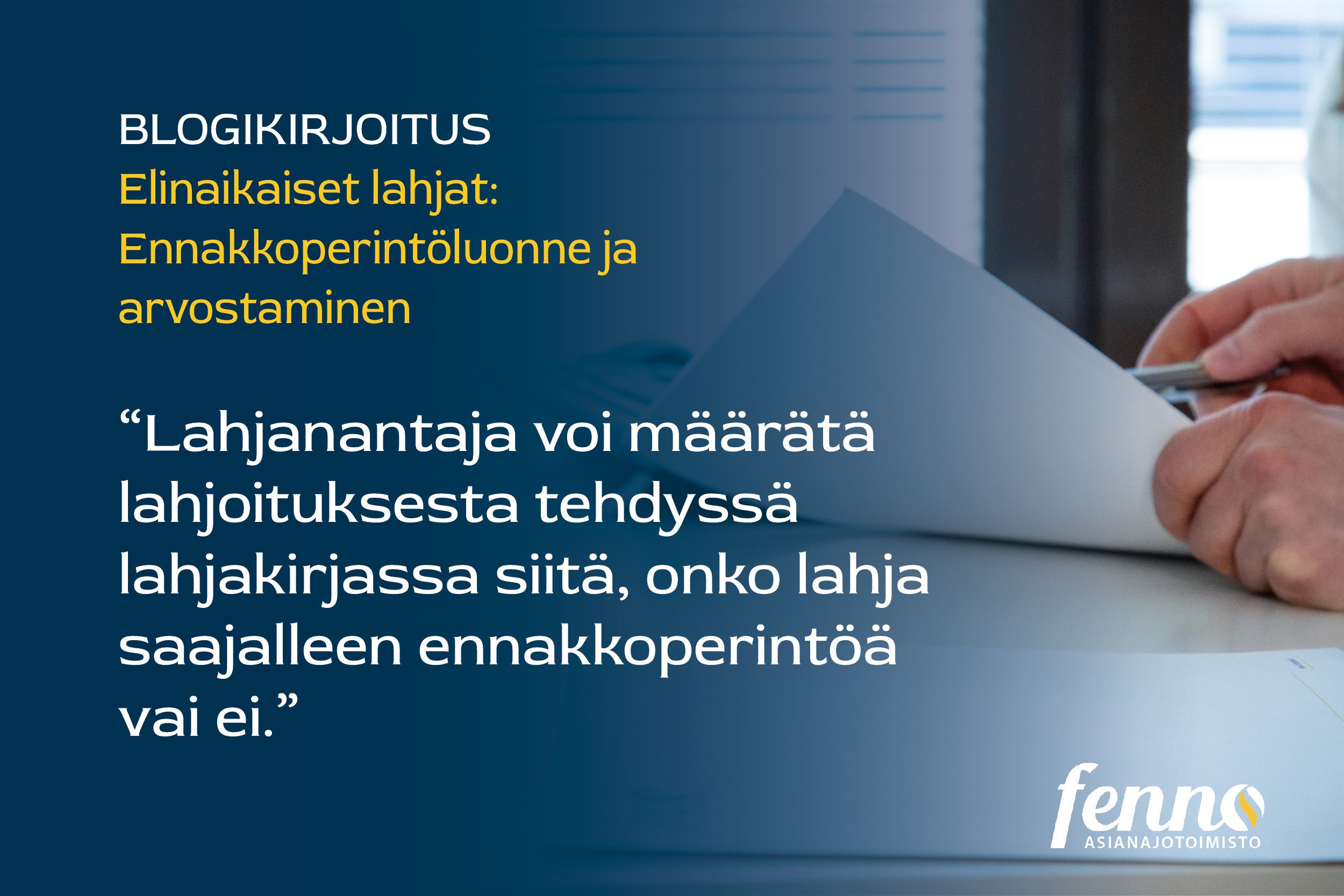 Elinaikaiset lahjoitukset ovat yleinen keino siirtää omaisuutta perillisille elinaikana. Lahjoituksilla voidaan saavuttaa verohyötyä ja jälkipolvilla voi olla enemmän tarvetta omaisuudelle elämäntilanteensa vuoksi kuin mahdollisesti ikääntyvällä lahjanantajalla. Ennen lahjoitusten toteuttamista olisi kuitenkin syytä tiedostaa lahjoituksiin liittyvät verokohtelu sekä perintö- ja aviovarallisuusoikeudellinen sääntelykehikko.